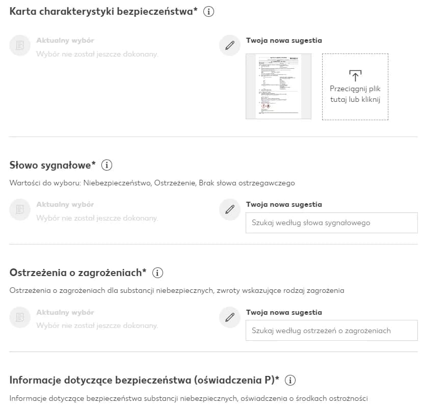 Układ kategorii na sklepie jest dość prosty. Po kilku razach, następne wystawienie aukcji będzie już proste. Najwięcej problemów przysporzyć nam może uzupełnienie specyfikacji (atrybutów). Większość informacji, o które prosi nas Kaufland w trakcie dodawania produktów, jest obowiązkowa do uzupełnienia. Niestety nie zawsze wiadomo o co autorowi chodziło… Początkujący użytkownicy mogą mieć problem z uzupełnieniem atrybutów. Pod tym względem Kaufland różni się od innych serwisów aukcyjnych. W przypadku produktów, których dystrybucja jest obwarowana obowiązkiem posiadania zezwoleń i certyfikatów, Kaufland wymaga ich dodania, poprzez wklejenia dokumentu np. karty charakterystyki bezpieczeństwa, podania słów sygnałowych, podania ostrzeżeń o zagrożeniach, informacji dotyczących bezpieczeństwa, itp. danych, o których przedstawienie nie trzeba było się martwić na innych serwisach aukcyjnych.