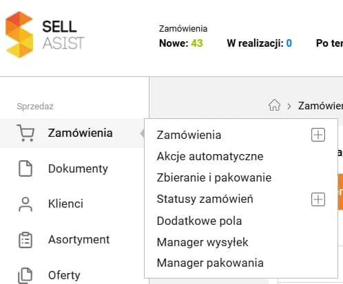 … Jednak w tym miejscu skupimy się na sekcji SPRZEDAŻ i jej dwóch najważniejszych zakładach: Zamówienia i akcje automatyczne (dość istotna jest też podsekcja Zbieranie i pakowanie [WMS], ale podsekcję tą omówimy w innym miejscu: „Jakie korzyści posiada Sellasist WMS„).