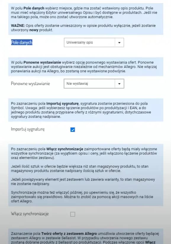 Importujemy oferty po kolei z każdego konta osobno. Import może potrwać długo. Pobieramy oferty aktywne i nieaktywne (zamknięte, ale jeszcze zarchiwizowane). Sellasist odzwierciedla opis z Allegro.